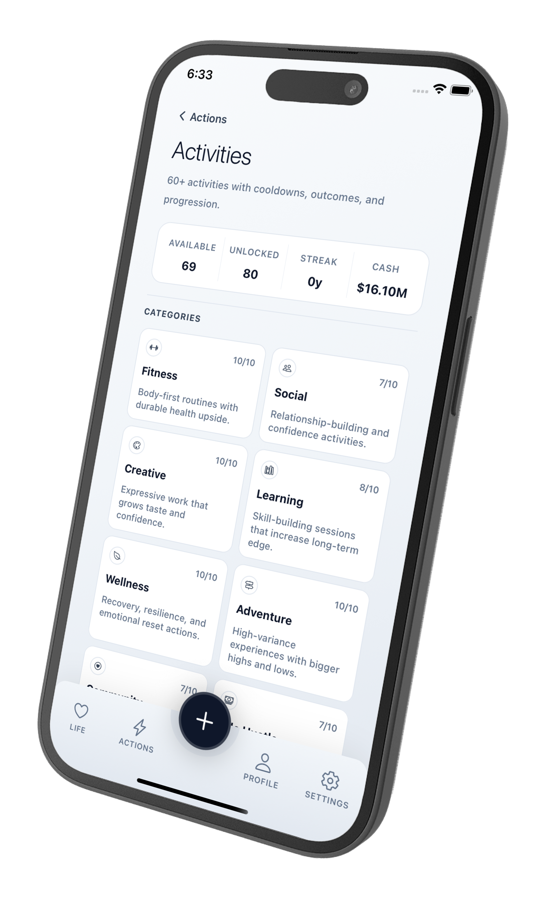 Spend your time on what matters—fitness, socializing, creativity, or learning. Each activity builds mastery and streaks that unlock better outcomes. Push harder for bigger rewards or play it safe to protect your gains. Your daily choices shape your stats, skills, and story.